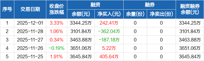 融资方面,当日融资买入946.78万元,融资偿还704.36万元,融资净买入242.41万元。融券方面,融券卖出0份,融券偿还0份,融券余量0份,融券余额0元。融资融券余额合计3344.25万元。