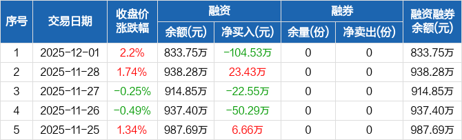 稀土ETF:融资净偿还104.53万元,融资余额833.75万元(12-01)