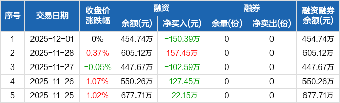 融资方面,当日融资买入260.2万元,融资偿还410.58万元,融资净偿还150.39万元。融券方面,融券卖出0份,融券偿还0份,融券余量0份,融券余额0元。融资融券余额合计454.74万元。