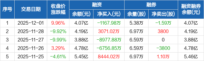 融资方面,当日融资买入1.94亿元,融资偿还2.06亿元,融资净偿还1167.98万元。融券方面,融券卖出0股,融券偿还1.59万股,融券余量5.38万股,融券余额45.14万元。融资融券余额合计4.07亿元。