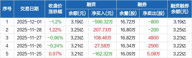 融资方面,当日融资买入1224.18万元,融资偿还1820.5万元,融资净偿还596.32万元。融券方面,融券卖出600股,融券偿还1400股,融券余量16.72万股,融券余额68.72万元。融资融券余额合计3.19亿元。