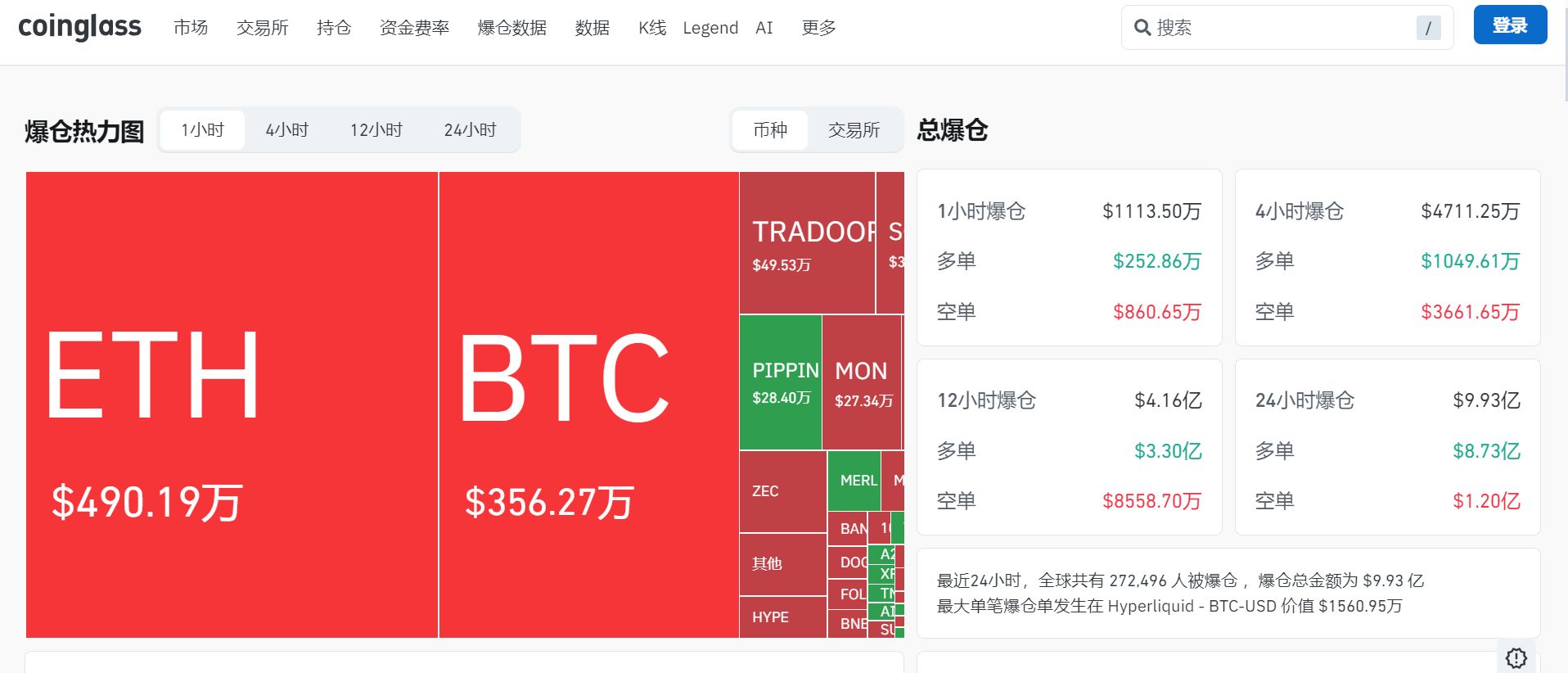 Coinglass数据显示,24小时内,爆仓人数超27万,爆仓总金额为9.93亿美元。
