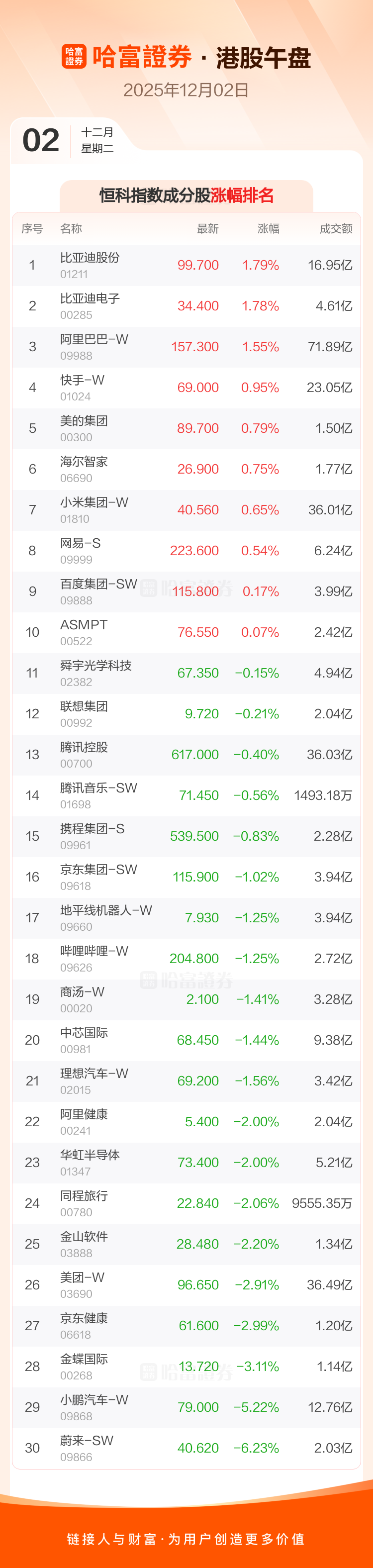 港股12月2日午盘走高,恒生指数收报26061.75点,涨28.49点,涨幅0.11%;恒生科技指数收报5614.77点,跌29.99点,跌幅0.53%。恒生指数成分股中信义玻璃、中国海洋石油、安踏体育涨幅居前,京东健康、美团-W、阿里健康跌幅靠前。恒生科技指数成分股中比亚迪股份、比亚迪电子、阿里巴巴-W涨幅居前,蔚来-SW、小鹏汽车-W、金蝶国际跌幅靠前。