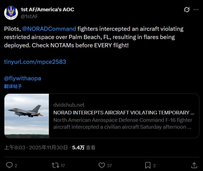中新网12月2日电据美国哥伦比亚广播公司(CBS)报道,北美防空司令部称,当地时间11月29日,美军出动F-16战斗机拦截了一架飞越佛罗里达州棕榈滩临时禁飞区的民用飞机。美国总统特朗普的海湖庄园就位于棕榈滩。