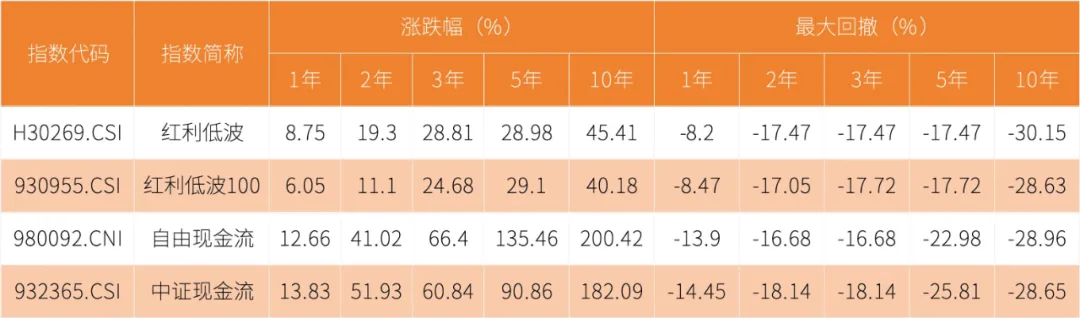 文章《红利低波ETF和红利ETF哪个更值得投资?》中,分析了各种红利指数的收益和风险情况,红利低波指数和红利低波100指数的整体表现比较均衡,适合求稳的投资者。现在,用同样的方式,算一算自由现金流指数的表现。下面这个表格汇总了关键数据: