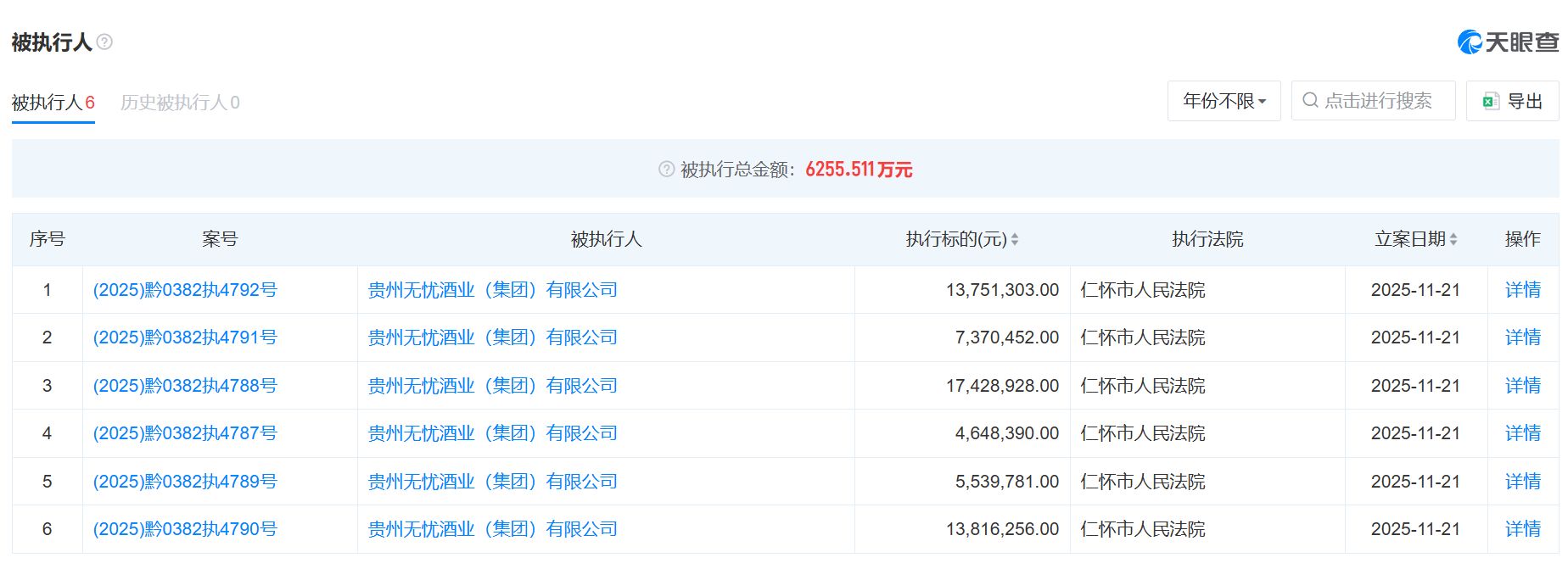 11月21日,贵州省遵义市仁怀市人民法院的6份执行裁定书,将茅台镇知名酱酒企业——无忧酒业,骤然推至行业舆论的焦点。据悉,公司此次被执行总金额达6255.51万元,这也是无忧酒业首次被列为被执行人。
