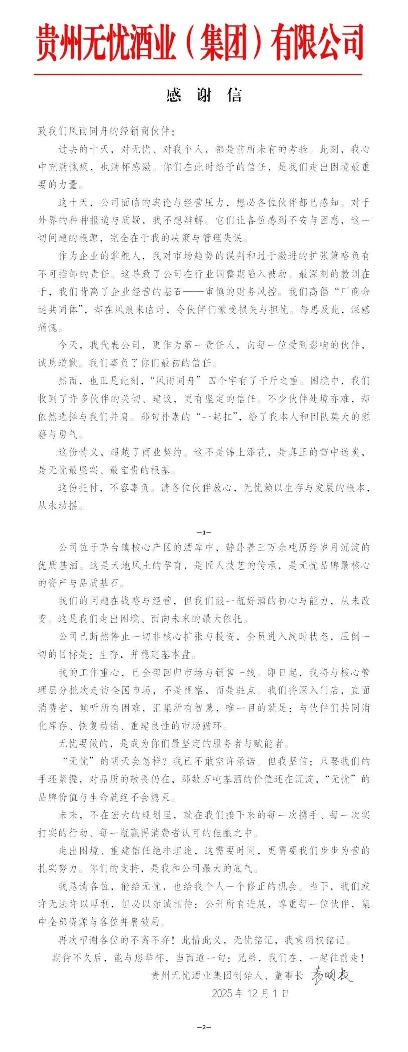 “过去的十天,对无忧、对我个人,都是前所未有的考验。”12月1日,贵州无忧酒业(集团)有限公司(以下简称“无忧酒业”)创始人、董事长袁明权发表致经销商伙伴的感谢信(以下简称“公开信”),并在信中向每一位受到影响的经销商致歉。