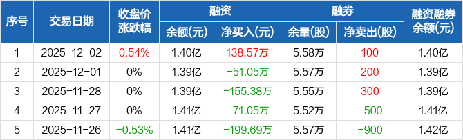 融资方面,当日融资买入672.16万元,融资偿还533.59万元,融资净买入138.57万元。融券方面,融券卖出1000股,融券偿还900股,融券余量5.58万股,融券余额10.43万元。融资融券余额合计1.4亿元。