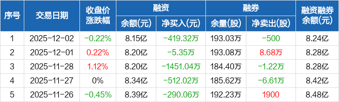 融资方面,当日融资买入1563.67万元,融资偿还1982.99万元,融资净偿还419.32万元,连续5日净偿还累计2677.79万元。融券方面,融券卖出7000股,融券偿还7500股,融券余量193.03万股,融券余额868.64万元。融资融券余额合计8.24亿元。