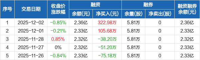 融资方面,当日融资买入439.16万元,融资偿还116.18万元,融资净买入322.98万元。融券方面,融券卖出0股,融券偿还0股,融券余量5.81万股,融券余额54.5万元。融资融券余额合计2.36亿元。