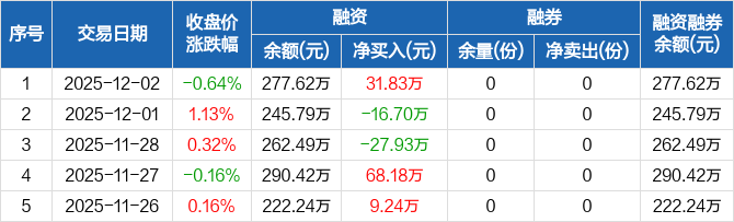融资方面,当日融资买入162.52万元,融资偿还130.7万元,融资净买入31.83万元。融券方面,融券卖出0份,融券偿还0份,融券余量0份,融券余额0元。融资融券余额合计277.62万元。