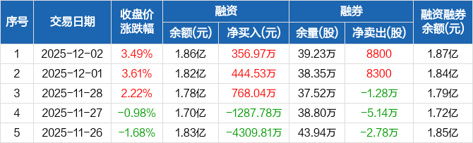 融资方面,当日融资买入4632.07万元,融资偿还4275.09万元,融资净买入356.97万元,连续3日净买入累计1569.54万元。融券方面,融券卖出2.49万股,融券偿还1.61万股,融券余量39.23万股,融券余额174.57万元。融资融券余额合计1.87亿元。