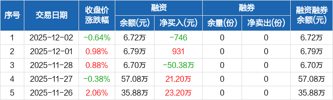融资方面,当日融资买入24.87万元,融资偿还24.95万元,融资净偿还746元。融券方面,融券卖出0份,融券偿还0份,融券余量0份,融券余额0元。融资融券余额合计6.72万元。