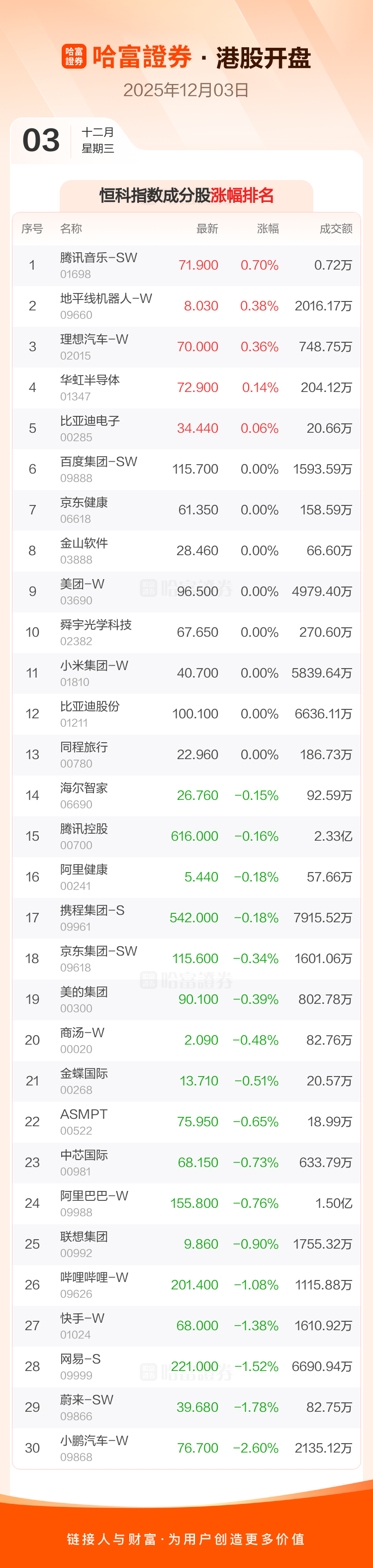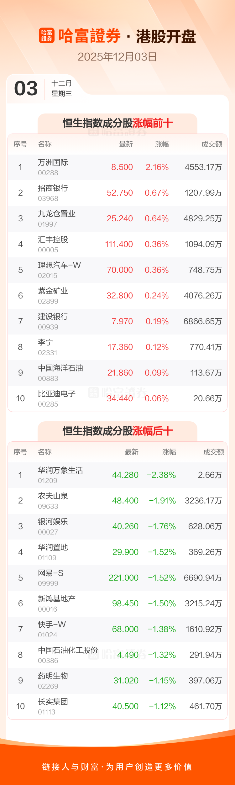 港股12月3日低开 ,恒生指数开盘报25980.89点,跌114.16点,跌幅0.44%;恒生科技指数开盘报5595.53点,跌28.51点,跌幅0.51%。恒生指数成分股中万洲国际、招商银行、九龙仓置业涨幅居前华润万象生活、农夫山泉、银河娱乐跌幅靠前恒生科技指数成分股中腾讯音乐-SW、地平线机器人-W、理想汽车-W涨幅居前小鹏汽车-W、蔚来-SW、网易-S跌幅靠前