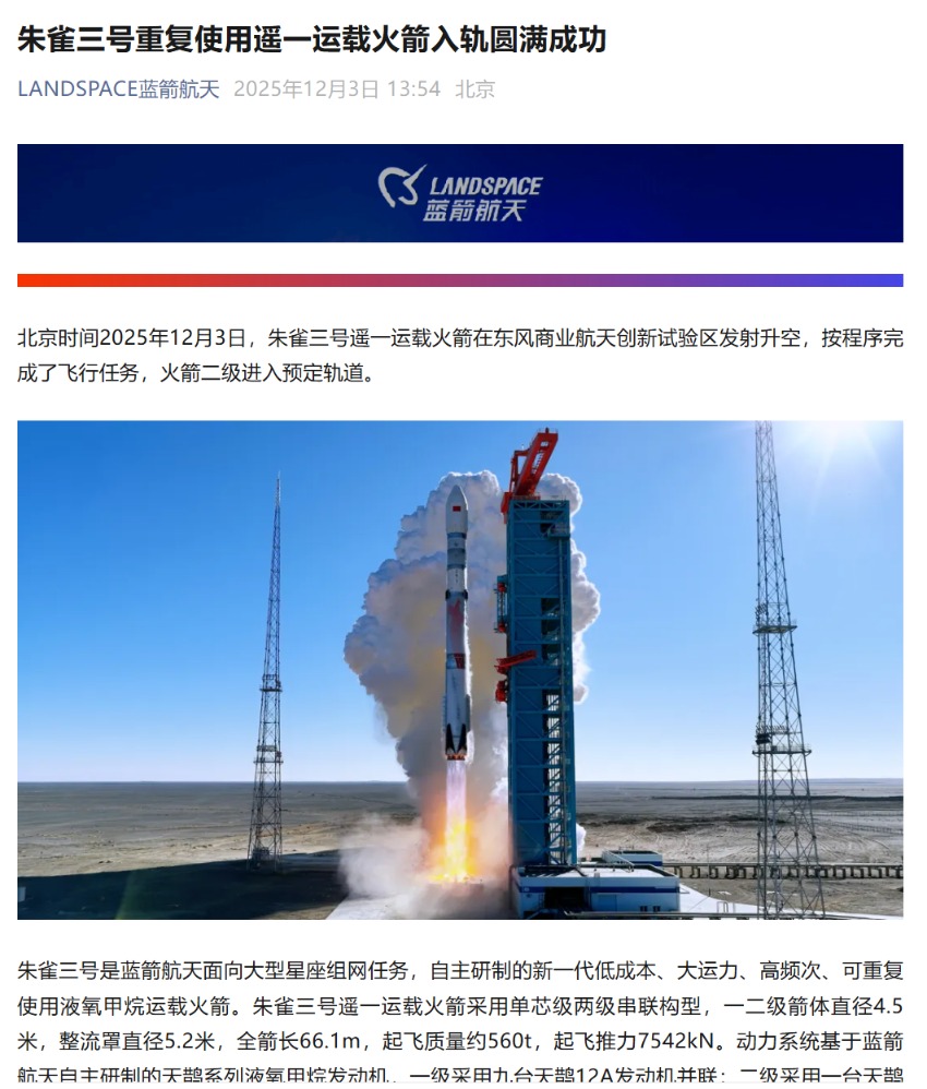 蓝箭航天发文表示,北京时间2025年12月3日,朱雀三号遥一运载火箭在东风商业航天创新试验区发射升空,按程序完成了飞行任务,火箭二级进入预定轨道。