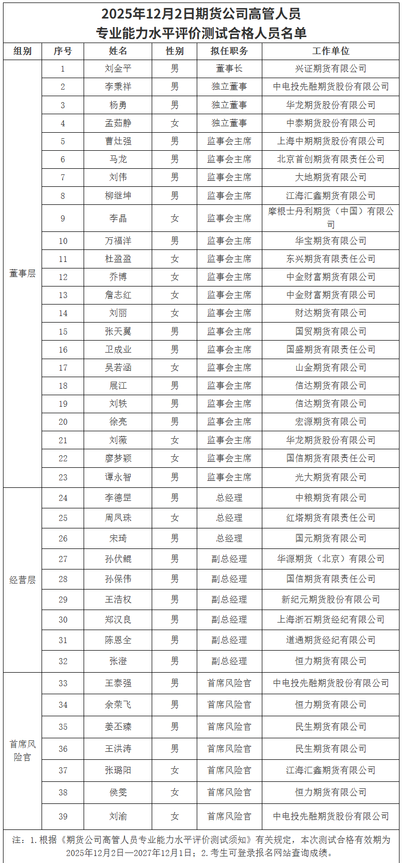 上证报中国证券网讯(记者费天元)中国期货业协会日前发布“2025年12月2日期货公司高管人员专业能力水平评价测试合格人员名单”,兴证期货拟任董事长刘金平通过专业能力水平评价测试。同时通过测试的还有中粮期货拟任总经理李德罡、红塔期货拟任总经理周凤珠、国元期货拟任总经理宋琦。
