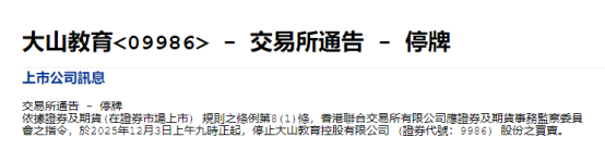 12月3日,香港证券及期货事务监察委员会(以下简称“香港证监会”)已根据相关规则指示香港联合交易所有限公司(联交所),自2025年12月3日上午9时正起,暂停大山教育(09986.HK)的股份交易。