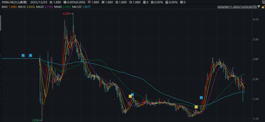 行情资料显示,2024年11月,大山教育股价一度冲高至4.28港元/股(前复权,下同),随后开始回调,今年7月一度跌至1.14港元/股。而随后,8—9月大山教育股价一度暴涨超100%,最高至2.95港元/股,随后股价又再次走向下跌趋势。