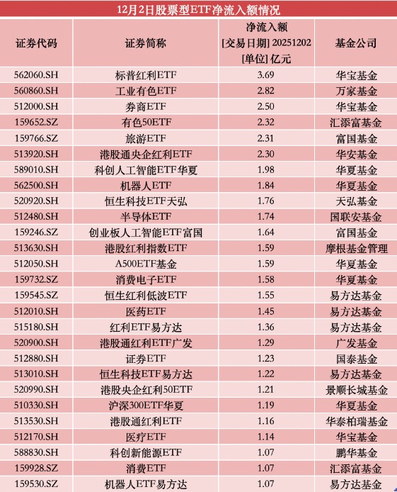 澎湃新闻记者据Wind数据统计,12月2日当日,全市场1270只可统计的股票型ETF(含跨境ETF)净流入金额为16.19亿元。其中,华宝标普红利ETF、万家工业有色ETF的净流入额居前,分别为3.69亿元、2.82亿元。