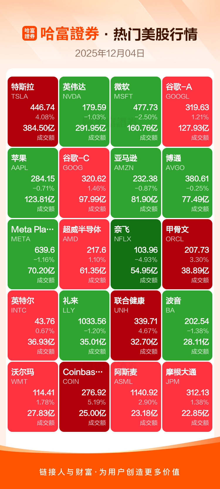 特斯拉涨4.08%,英伟达跌1.03%,微软跌2.50%,谷歌-A涨1.21%,苹果跌0.71%,谷歌-C涨1.46%,亚马逊跌0.87%,博通跌0.25%,Meta Platforms Inc-A跌1.16%,超威半导体涨1.10%。