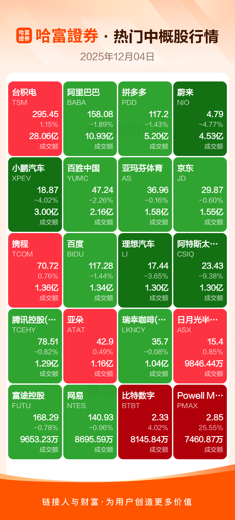 台积电涨1.15%,阿里巴巴跌1.89%,拼多多跌1.43%,蔚来跌4.77%,小鹏汽车跌4.02%,百胜中国跌2.26%,亚玛芬体育跌0.16%,京东跌0.60%,携程涨0.76%,百度跌1.44%。