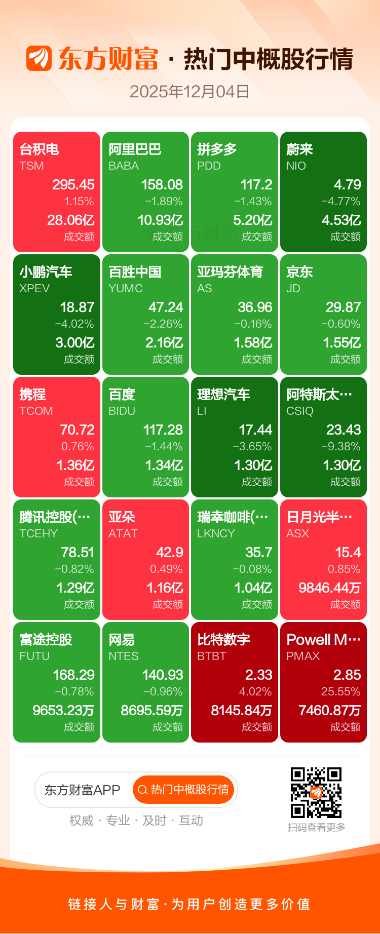 台积电涨1.15%,阿里巴巴跌1.89%,拼多多跌1.43%,蔚来跌4.77%,小鹏汽车跌4.02%,百胜中国跌2.26%,亚玛芬体育跌0.16%,京东跌0.60%,携程涨0.76%,百度跌1.44%。