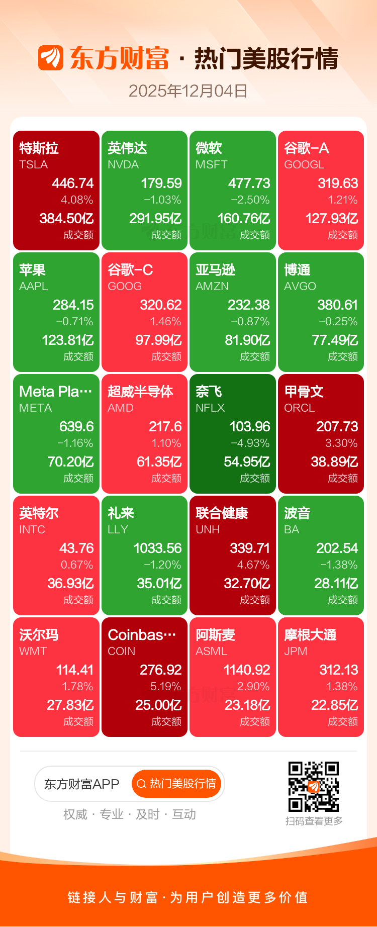 特斯拉涨4.08%,英伟达跌1.03%,微软跌2.50%,谷歌-A涨1.21%,苹果跌0.71%,谷歌-C涨1.46%,亚马逊跌0.87%,博通跌0.25%,Meta Platforms Inc-A跌1.16%,超威半导体涨1.10%。