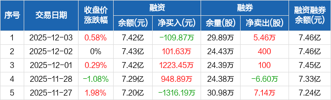 融资方面,当日融资买入888.21万元,融资偿还998.08万元,融资净偿还109.87万元。融券方面,融券卖出5.58万股,融券偿还1200股,融券余量29.89万股,融券余额415.17万元。融资融券余额合计7.46亿元。