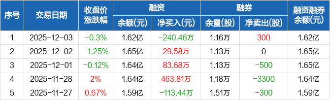 融资方面,当日融资买入711.73万元,融资偿还952.19万元,融资净偿还240.46万元。融券方面,融券卖出300股,融券偿还0股,融券余量1.16万股,融券余额19.22万元。融资融券余额合计1.62亿元。