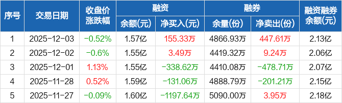 融资方面,当日融资买入1200.42万元,融资偿还1045.09万元,融资净买入155.33万元。融券方面,融券卖出512.03万份,融券偿还64.42万份,融券余量4866.93万份,融券余额5596.97万元。融资融券余额合计2.13亿元。
