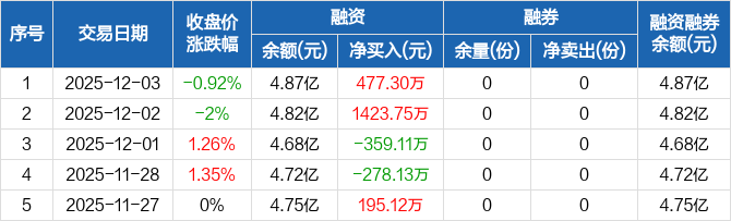 融资方面,当日融资买入3425.22万元,融资偿还2947.92万元,融资净买入477.3万元。融券方面,融券卖出0份,融券偿还0份,融券余量0份,融券余额0元。融资融券余额合计4.87亿元。