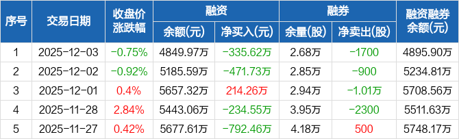 融资方面,当日融资买入352.36万元,融资偿还687.99万元,融资净偿还335.62万元。融券方面,融券卖出1700股,融券偿还3400股,融券余量2.68万股,融券余额45.94万元。融资融券余额合计4895.9万元。