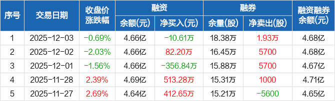 融资方面,当日融资买入448.21万元,融资偿还458.83万元,融资净偿还10.61万元。融券方面,融券卖出1.98万股,融券偿还500股,融券余量18.38万股,融券余额158.44万元。融资融券余额合计4.68亿元。