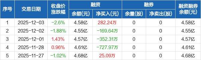 融资方面,当日融资买入2351.42万元,融资偿还2069.18万元,融资净买入282.24万元。融券方面,融券卖出0股,融券偿还0股,融券余量0股,融券余额0元。融资融券余额合计4.58亿元。