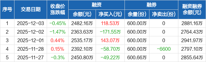 融资方面,当日融资买入153.24万元,融资偿还34.7万元,融资净买入118.53万元。融券方面,融券卖出0份,融券偿还0份,融券余量600万份,融券余额399万元。融资融券余额合计2881.16万元。