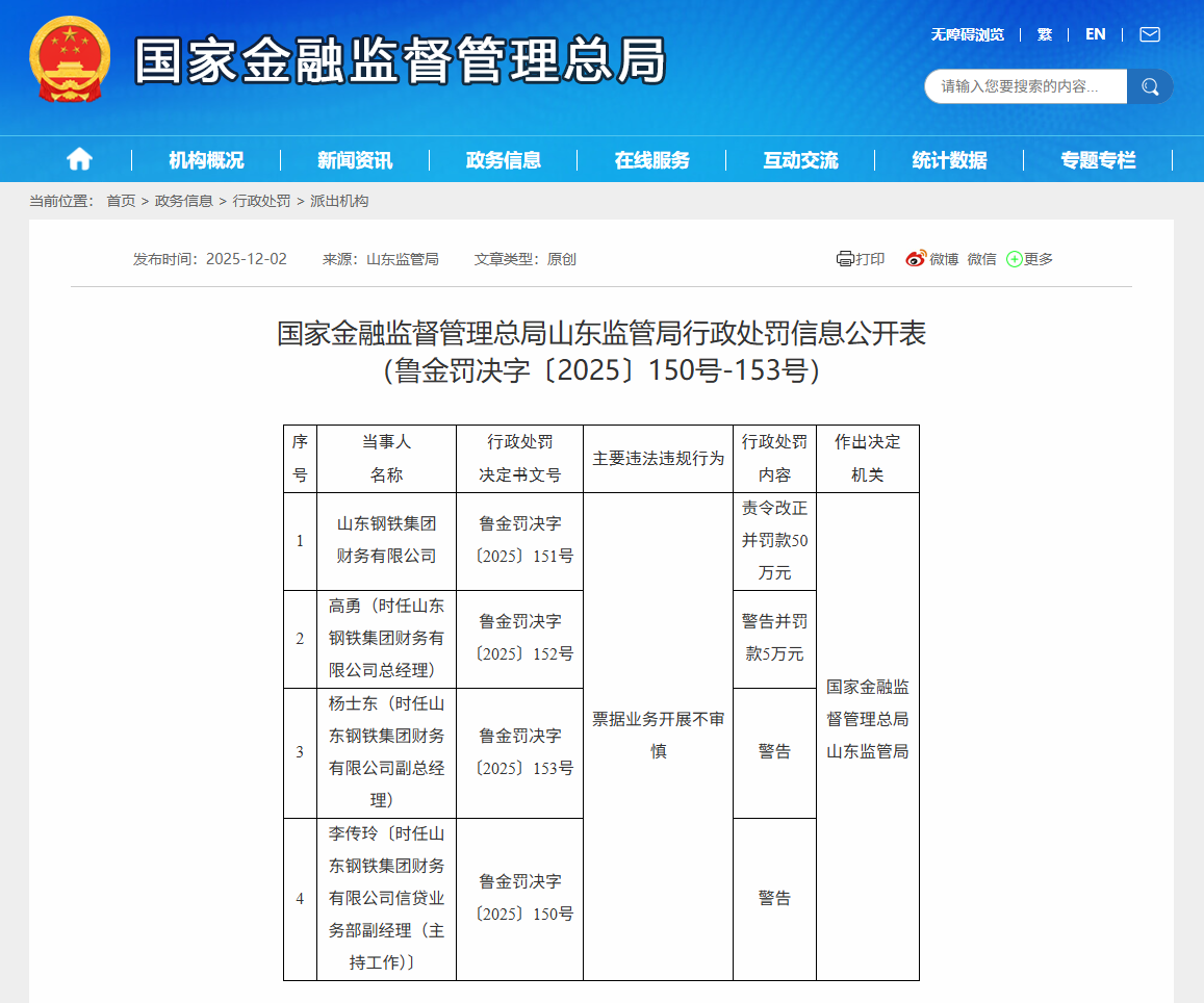 12月4日,国家金融监督管理总局山东监管局发布了一张罚单,剑指山东钢铁集团财务有限公司及其相关责任人。