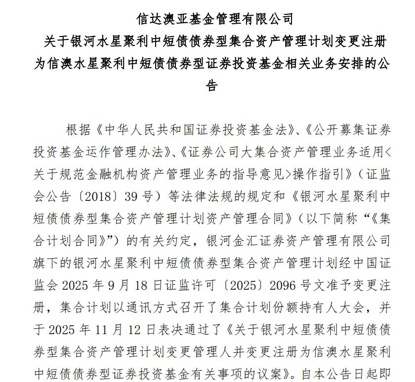 12月1日,信达澳亚基金公告称,银河水星聚利中短债债券型集合资管计划的管理人由银河金汇证券资管变更为信达澳亚基金,为券商资管“交棒”公募的收官浪潮再添一例。