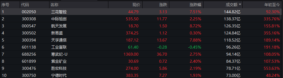 三花智控成交额居首,为144.82亿元。其后是中际旭创、航天发展、新易盛、天孚通信,成交额分别为138.37亿元、126.35亿元、124.84亿元、118.52亿元。