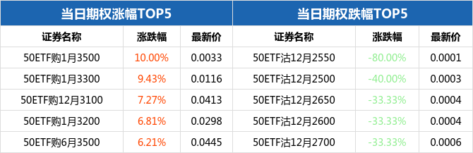 50ETF期权当日有98个合约正在交易。从涨跌幅来看,50ETF期权合约中,50ETF购1月3500涨幅最大,为10.00%,报收0.0033元;50ETF沽12月2550跌幅最大,为80.00%,报收0.0001元。