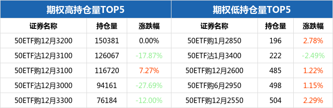从持仓量来看,50ETF期权合约中,50ETF购12月3200持仓量最大,为150381张,期权全日收平,报收0.0075元;持仓量最小的为50ETF购1月2850,共计196张,期权全日上涨2.78%,报收0.2736元。