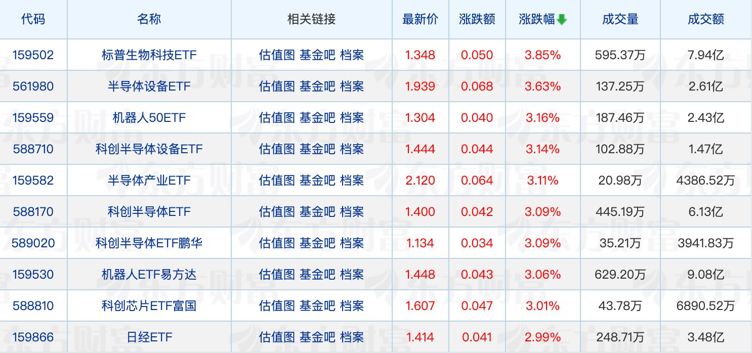 具体来看,标普生物科技ETF领涨3.85%,科创半导体ETF集体走强。