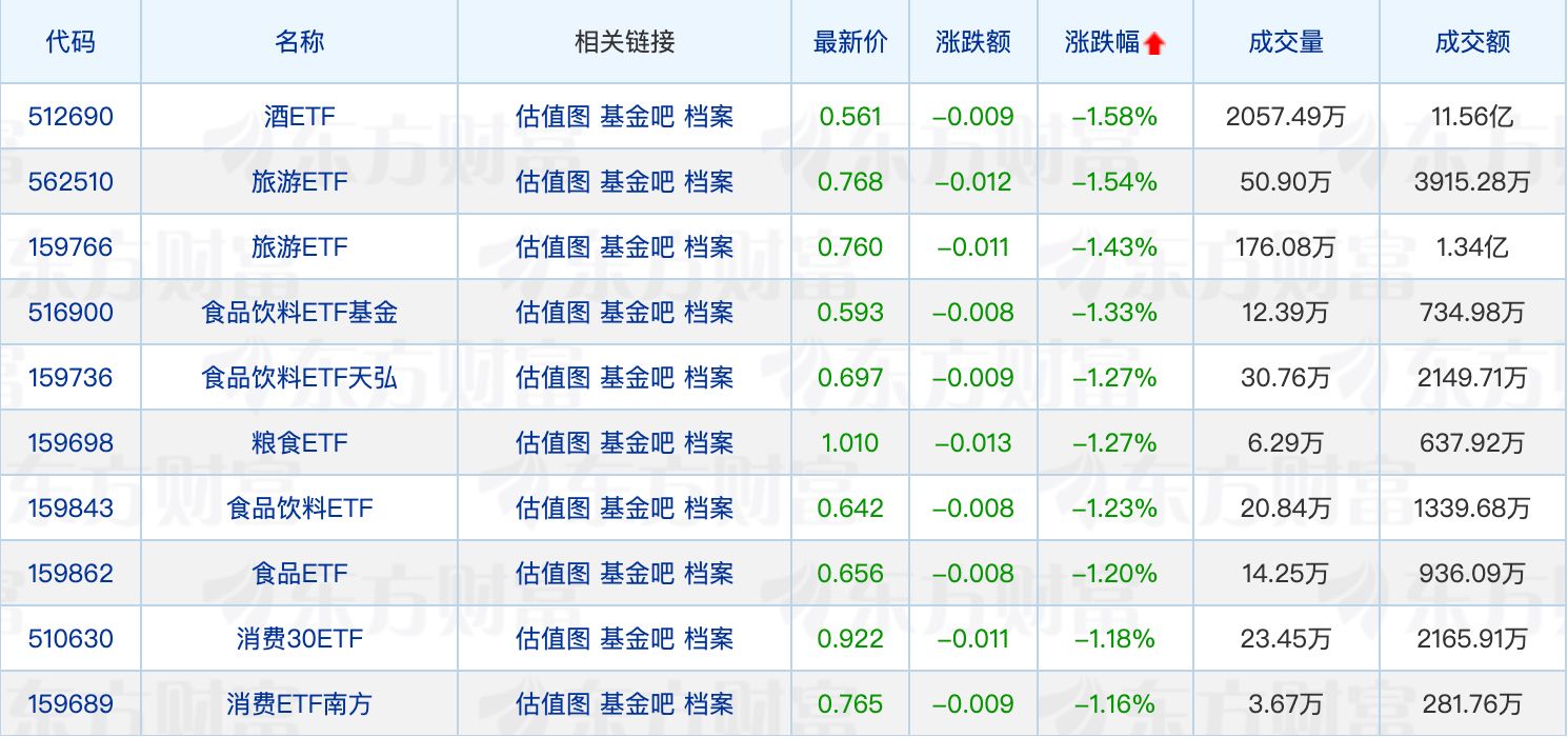 下跌方面,大消费板块震荡调整,同庆楼、海欣食品跌停。酒ETF领跌1.58%,旅游ETF、食品饮料ETF回调居前。