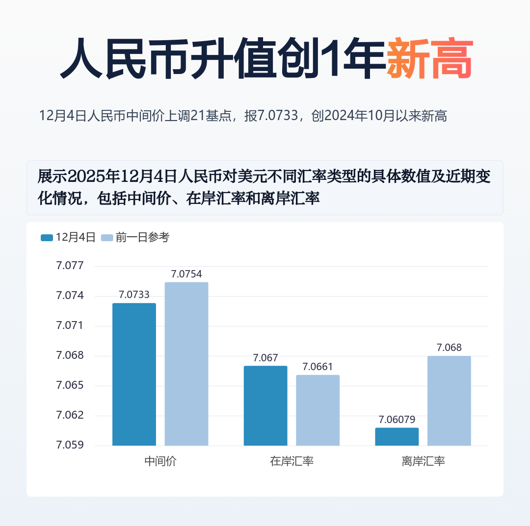 人民币这波升值有点猛啊!今天中间价直接调升21个基点,报7.0733,创下了2024年10月以来的新高。说实话,这个走势比我预想的还要强劲。