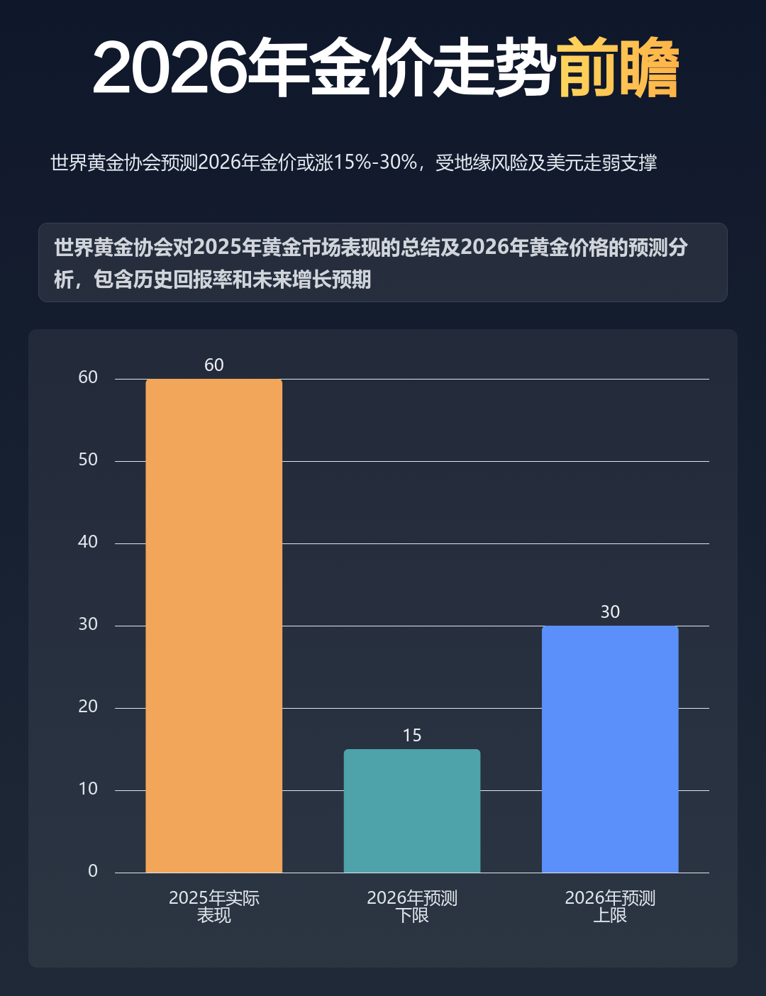 黄金这玩意儿最近真是越来越香了。世界黄金协会最新报告直接给市场打了剂强心针——2026年金价可能还要再冲高15%-30%,这相当于把2025年60%的涨幅再撕开个口子继续往上走。