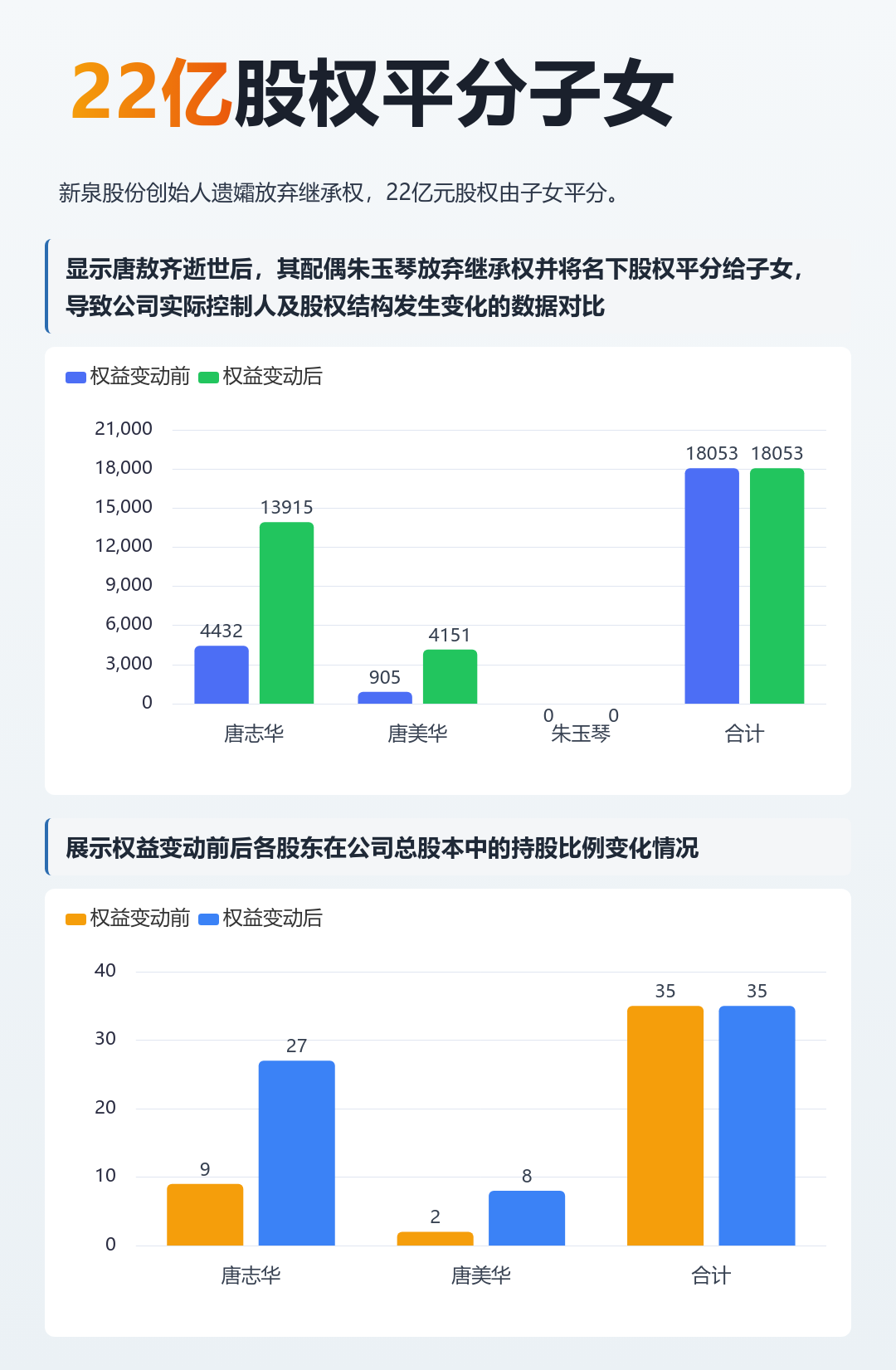 新泉股份创始人唐敖齐逝世后,家族股权分配方案终于尘埃落定。12月3日晚间公司公告显示,这位80岁企业家的遗孀朱玉琴女士做出了一个重大决定——放弃价值22亿元的股权继承权。