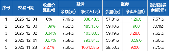 融资方面,当日融资买入771.07万元,融资偿还1109.55万元,融资净偿还338.48万元,连续4日净偿还累计1721.26万元。融券方面,融券卖出2.06万股,融券偿还3.35万股,融券余量57.81万股,融券余额841.66万元。融资融券余额合计7.57亿元。