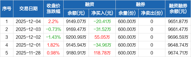融资方面,当日融资买入866.79万元,融资偿还887.2万元,融资净偿还20.41万元。融券方面,融券卖出0份,融券偿还0份,融券余量600万份,融券余额502.8万元。融资融券余额合计9651.87万元。
