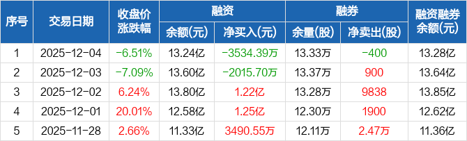 广和通融资融券信息显示,2025年12月4日融资净偿还3534.39万元;融资余额13.24亿元,较前一日下降2.6%。