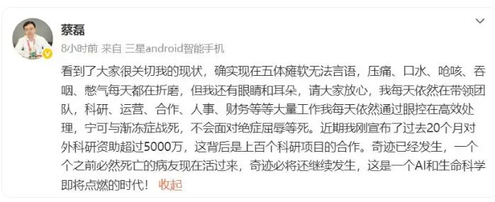 9月25日晚,蔡磊在社媒发文:看到了大家很关切我的现状,确实现在五体瘫软无法言语,压痛、口水、呛咳、吞咽、憋气每天都在折磨,但我还有眼睛和耳朵,请大家放心,我每天依然在带领团队,科研、运营、合作、人事、财务等等大量工作我每天依然通过眼控在高效处理。