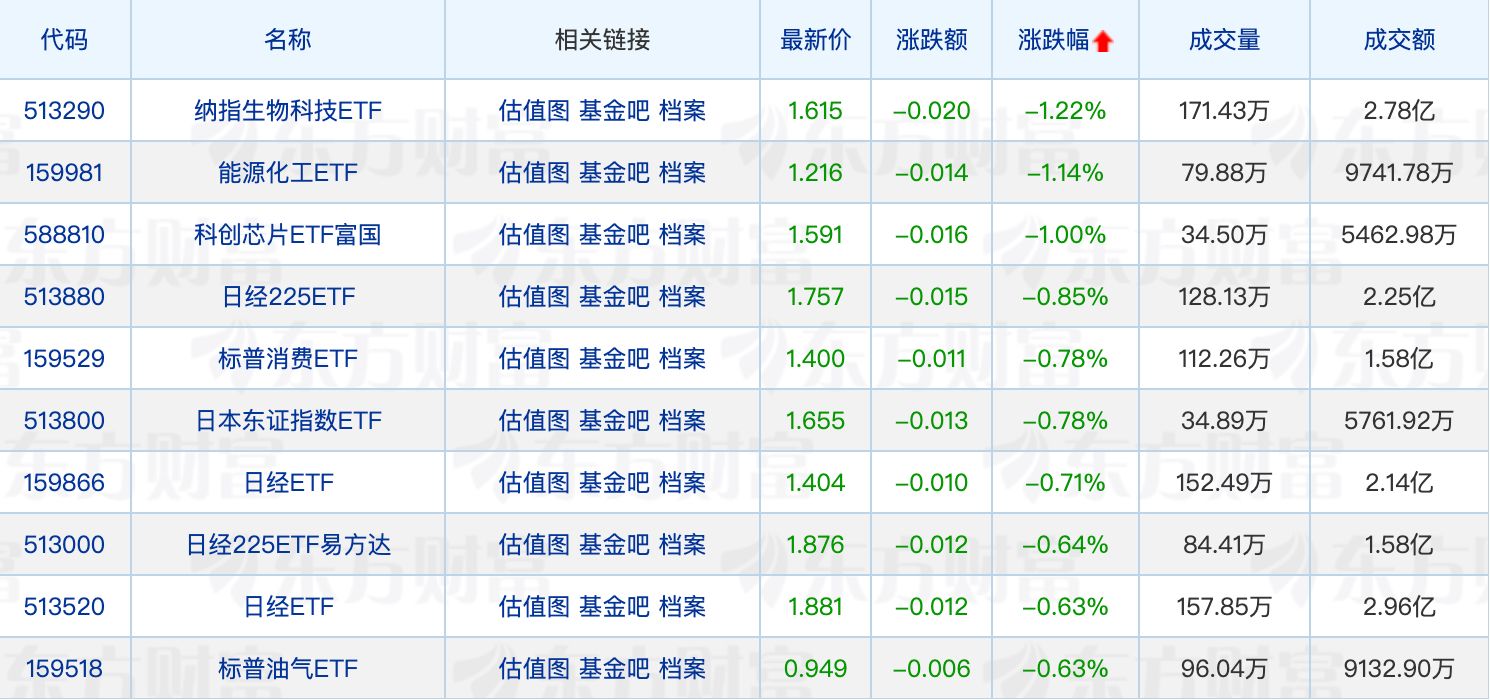 下跌方面,纳指生物科技ETF领跌1.22%,多只日经225相关ETF回调居前。